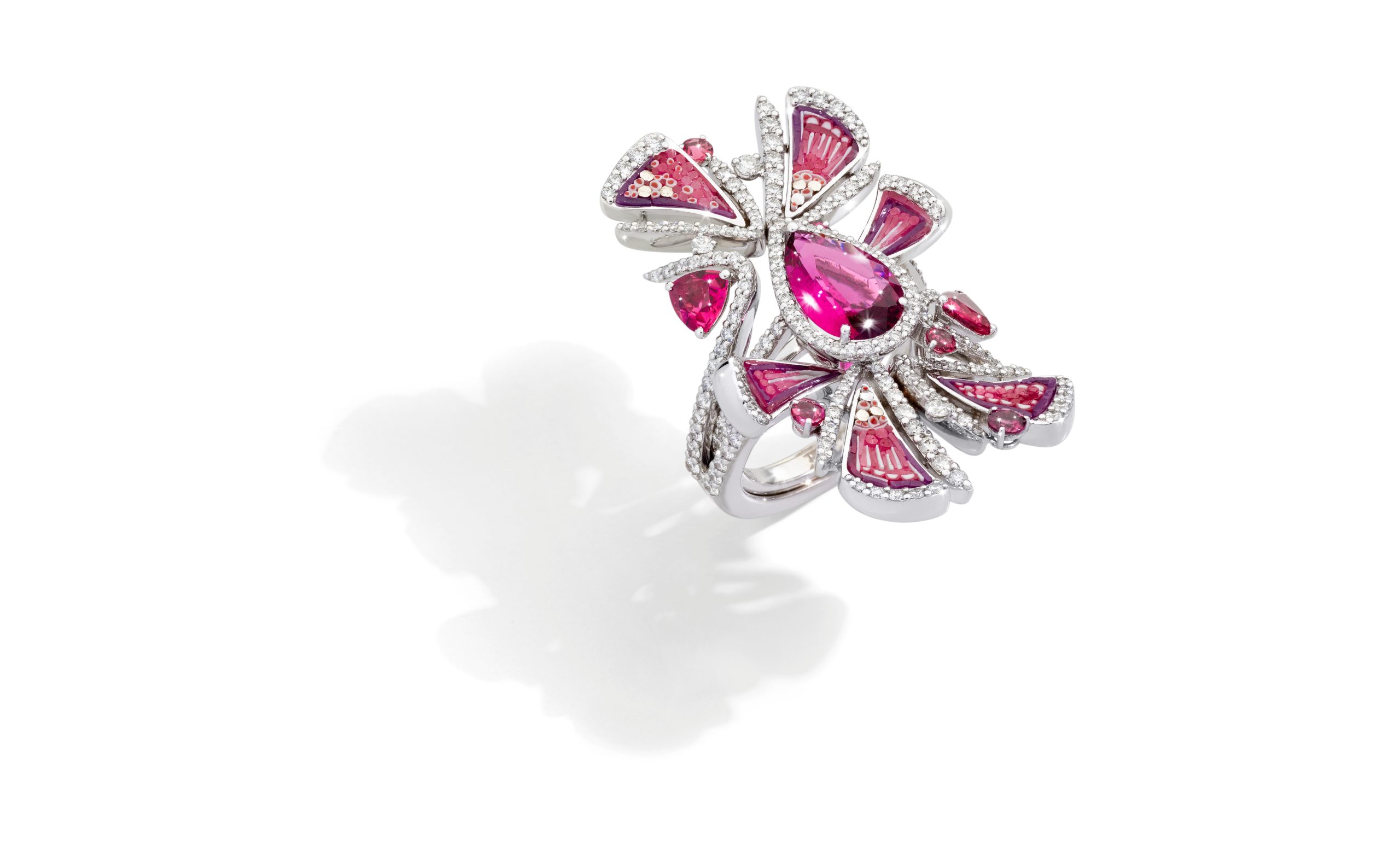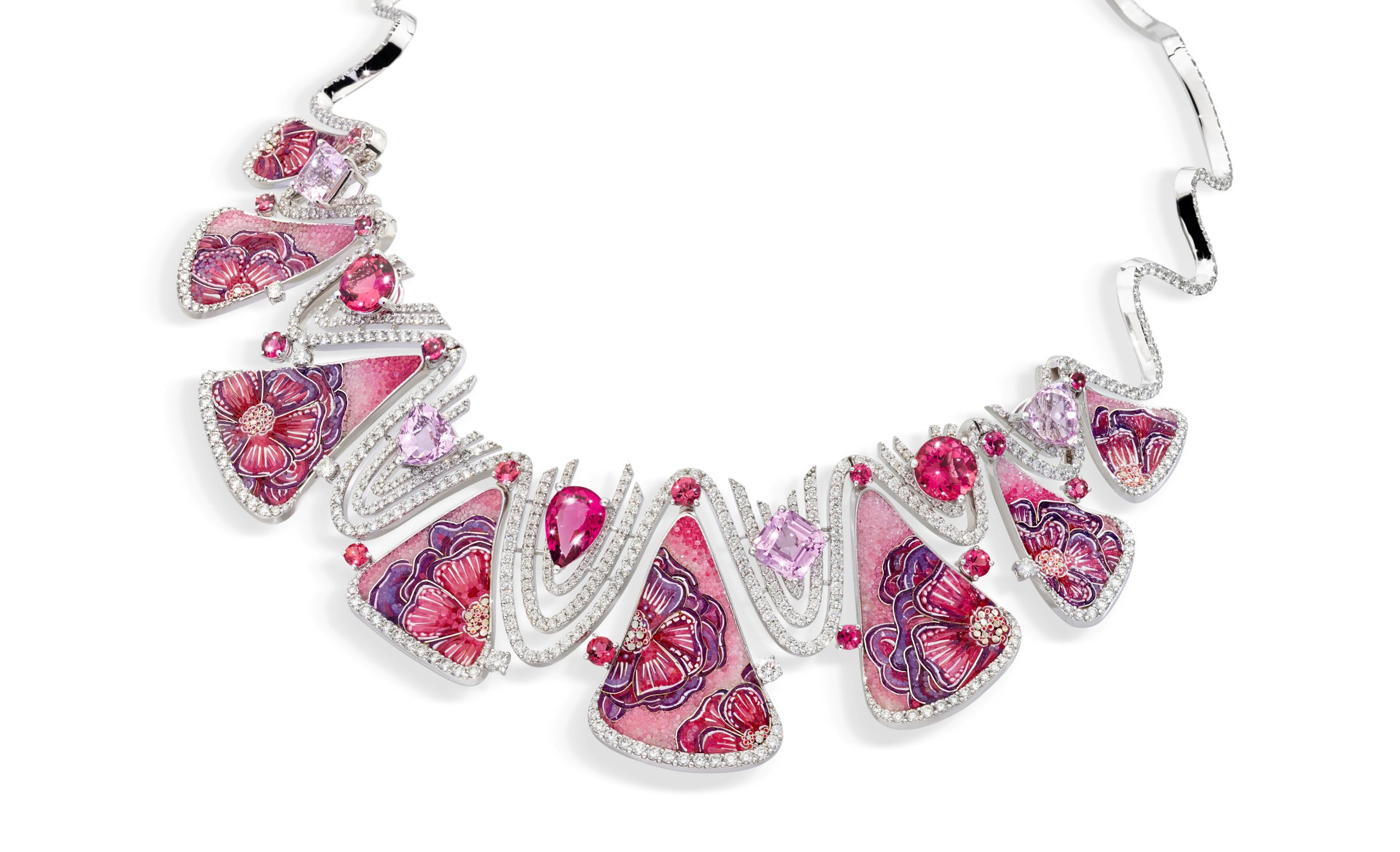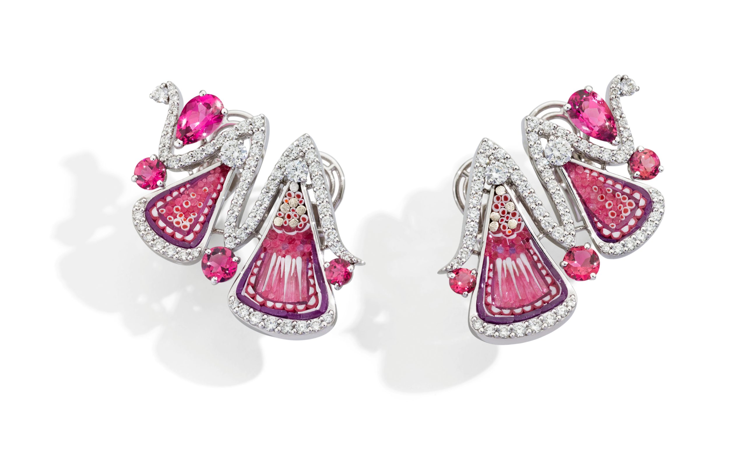 Micromosaic flowers infuse the pieces with a touch of whimsy and romance, while the diamonds, rubellites, and tourmalines add a dazzling sparkle that catches the light and captures attention.